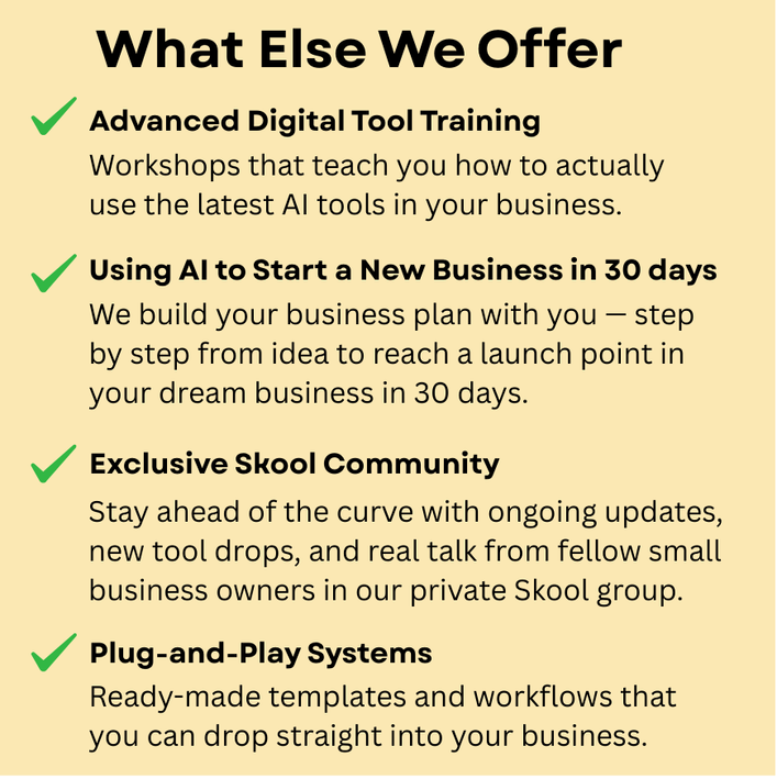 Every enrollment includes ongoing access to our private Skool community — where we share new tools, updates, and strategies so you’re always ahead of the curve.